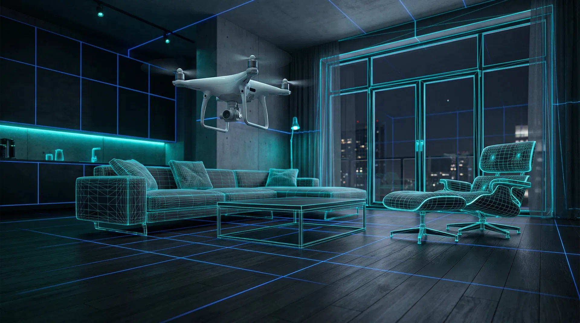 Drone autonomously executes a pre-programmed scanning route through the space.